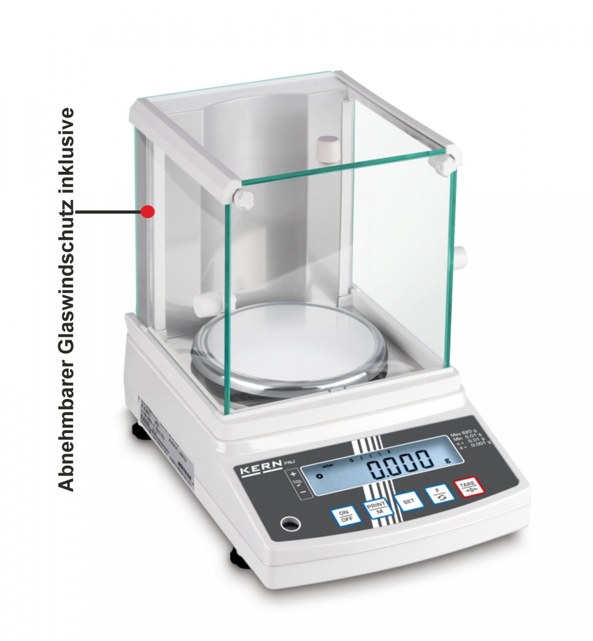 Der abnehmbare Glas-Windschutz mit drei leichtgängigen Schiebetüren gewährleistet komfortablen Zugriff auf das Wägegut und schützt gleichzeitig vor äußeren Einflüssen. Für besonders präzise Messungen lässt sich der Windschutz schnell und unkompliziert montieren.